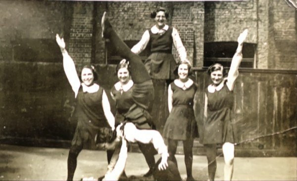 The photo above is of her doing gymnastics (she is the one upside down doing the handstand on the girl's knees!). We believe she worked as a bookbinder before the war started.