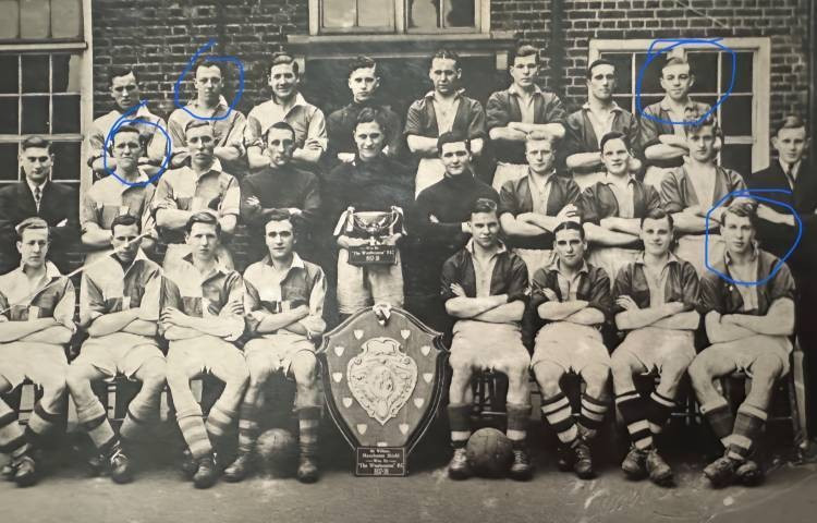 The photo below is of Westbourne Football Club. Dad is circled 2nd from left, middle row. Behind him (also circled) is Mum's eldest brother Alf, her youngest brother Fred is far right front row. Back row far right is Stan Farris - Jan's father in Law (Roy's father)